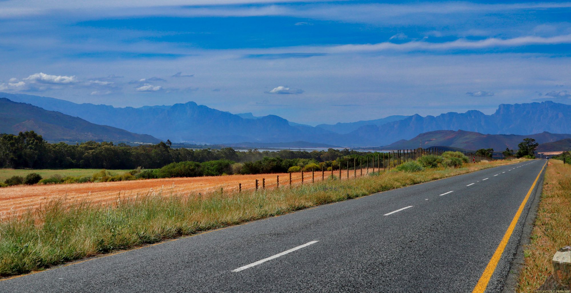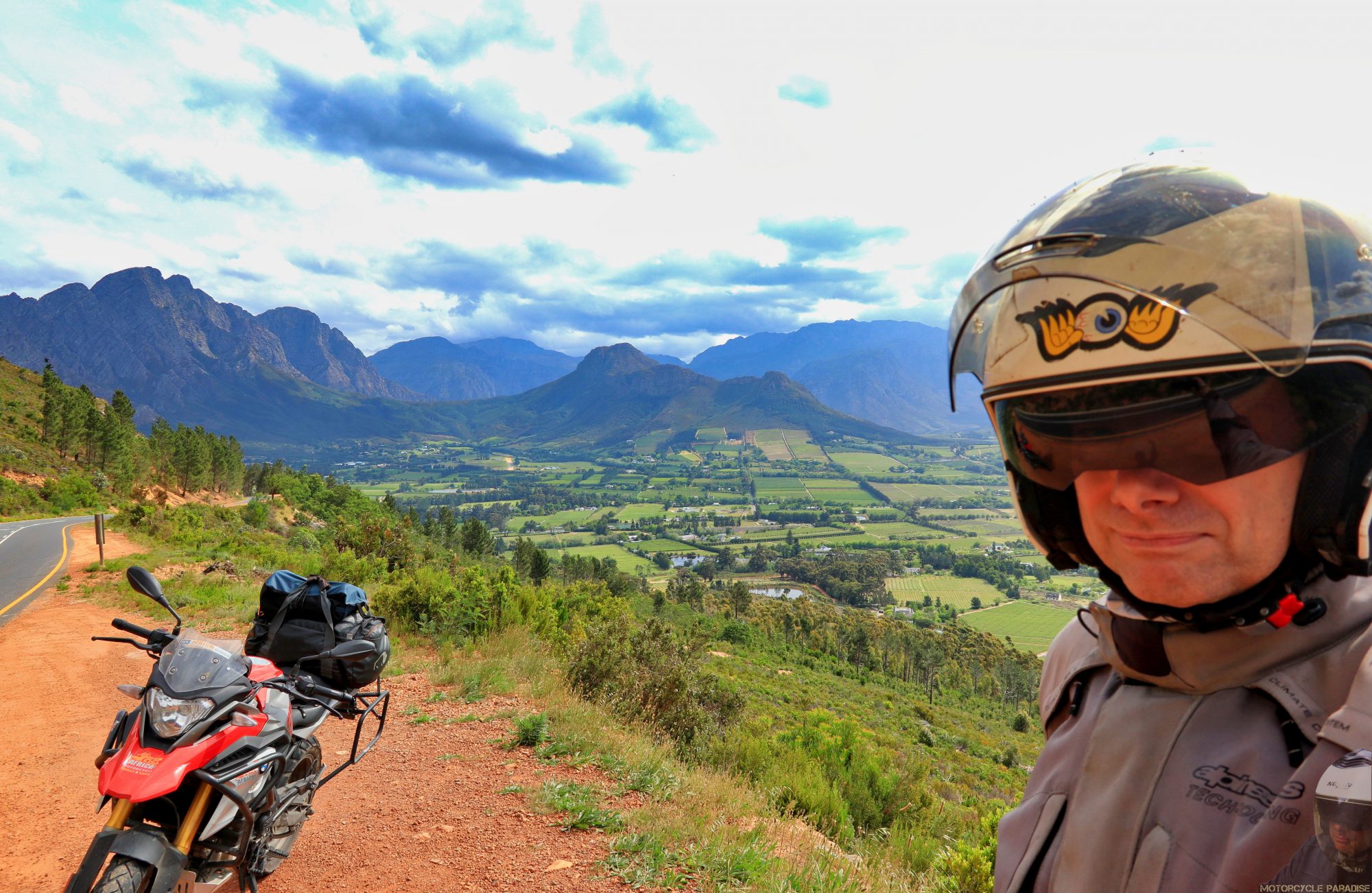 Rugged peaks all around me, I could stop every 10 minutes to take a photo it’s real pretty. I drop into South Africa’s wine district and the vineyards go forever.
