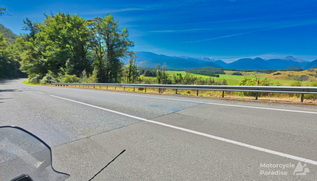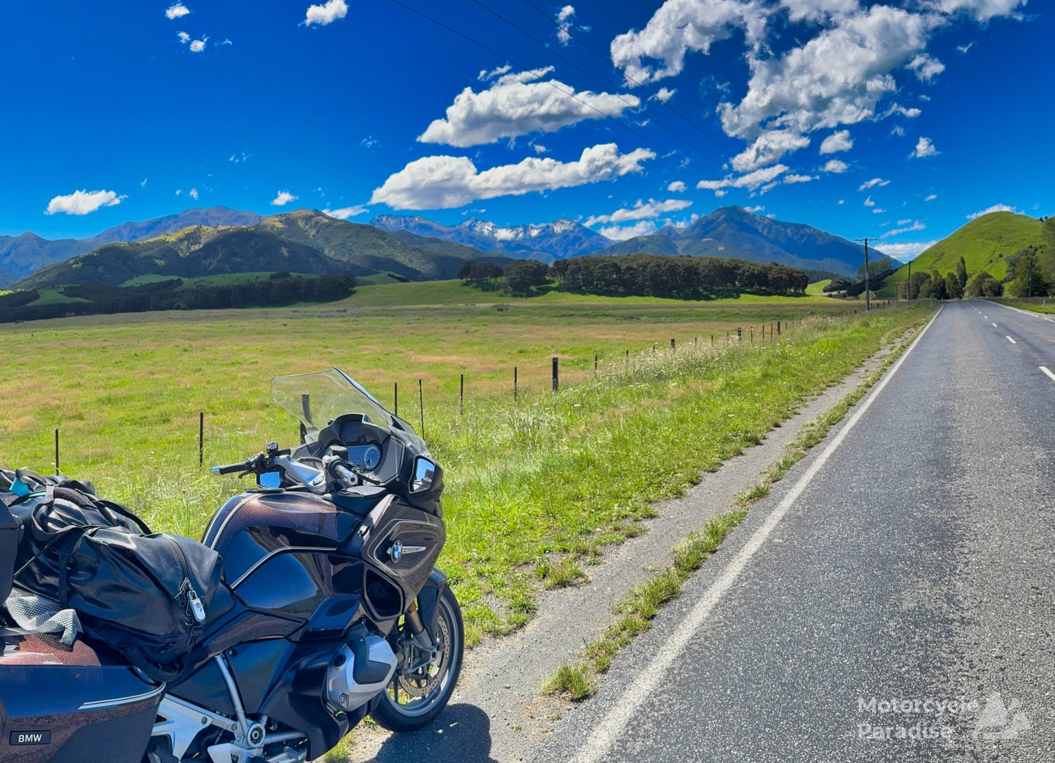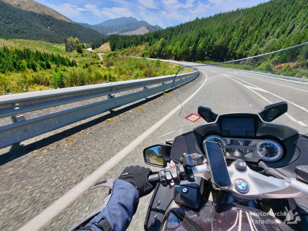 The inland route north of Waiau becomes a technical ride from the lower plains (above) you climb over Mt Lyford in an extended series of very tight corners. I put the R1250RT into Dynamic mode for this and it is amazing how much easier it corners in that mode. BMW are very good at getting these big bikes to handle much better than they probably should. The K1600GT I rode also transformed dramatically once in dynamic mode.