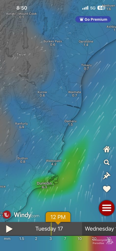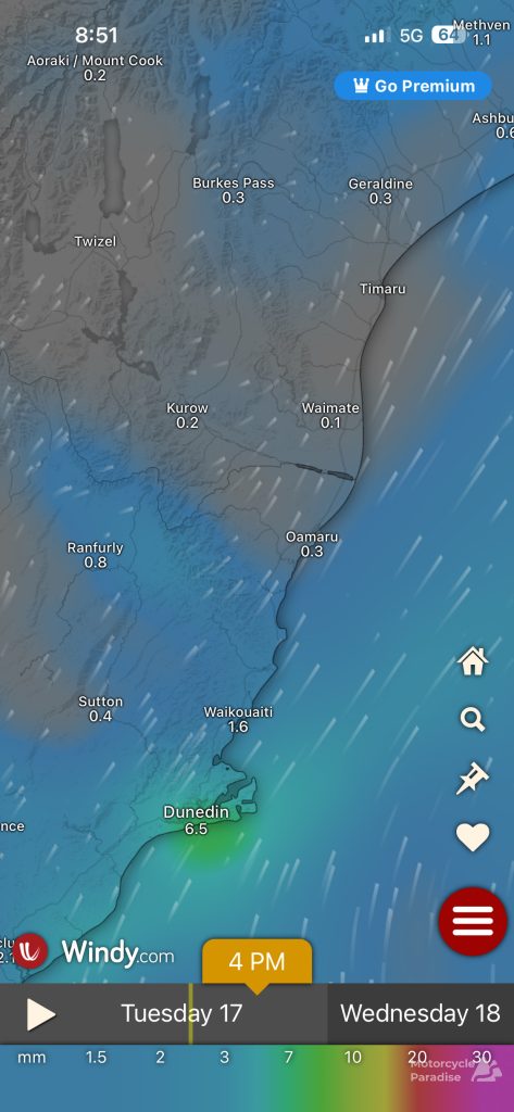 After some deliberation I have decided to ride my original route today which is a loop inland away from the coast via Twizel. The modelling on Windy suggests the rain will decrease and I could get some dry riding. But it’s a gamble.