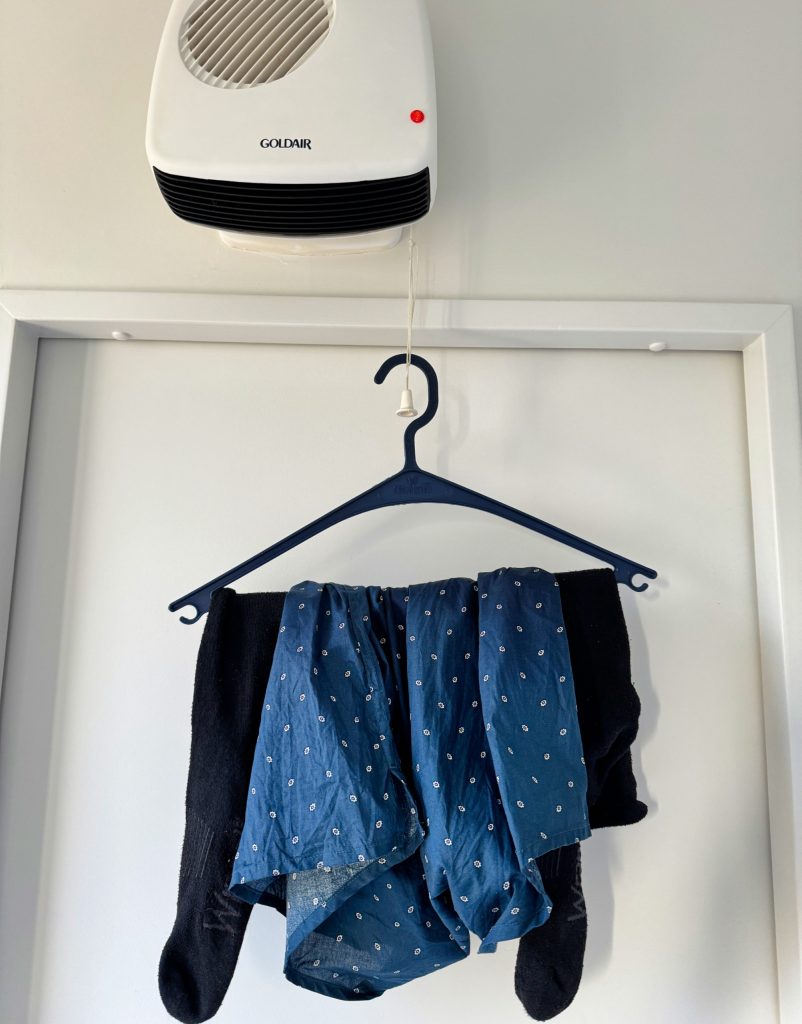 However underwear and socks and my quick dry shirts I always try to wash daily if I can find a way to dry them. This is my latest trick, for motels that have these blower heaters in bathrooms. (like here in NZ) Tie a loop then hang items, turn on heater, close bathroom door and Bob’s your uncle :D.